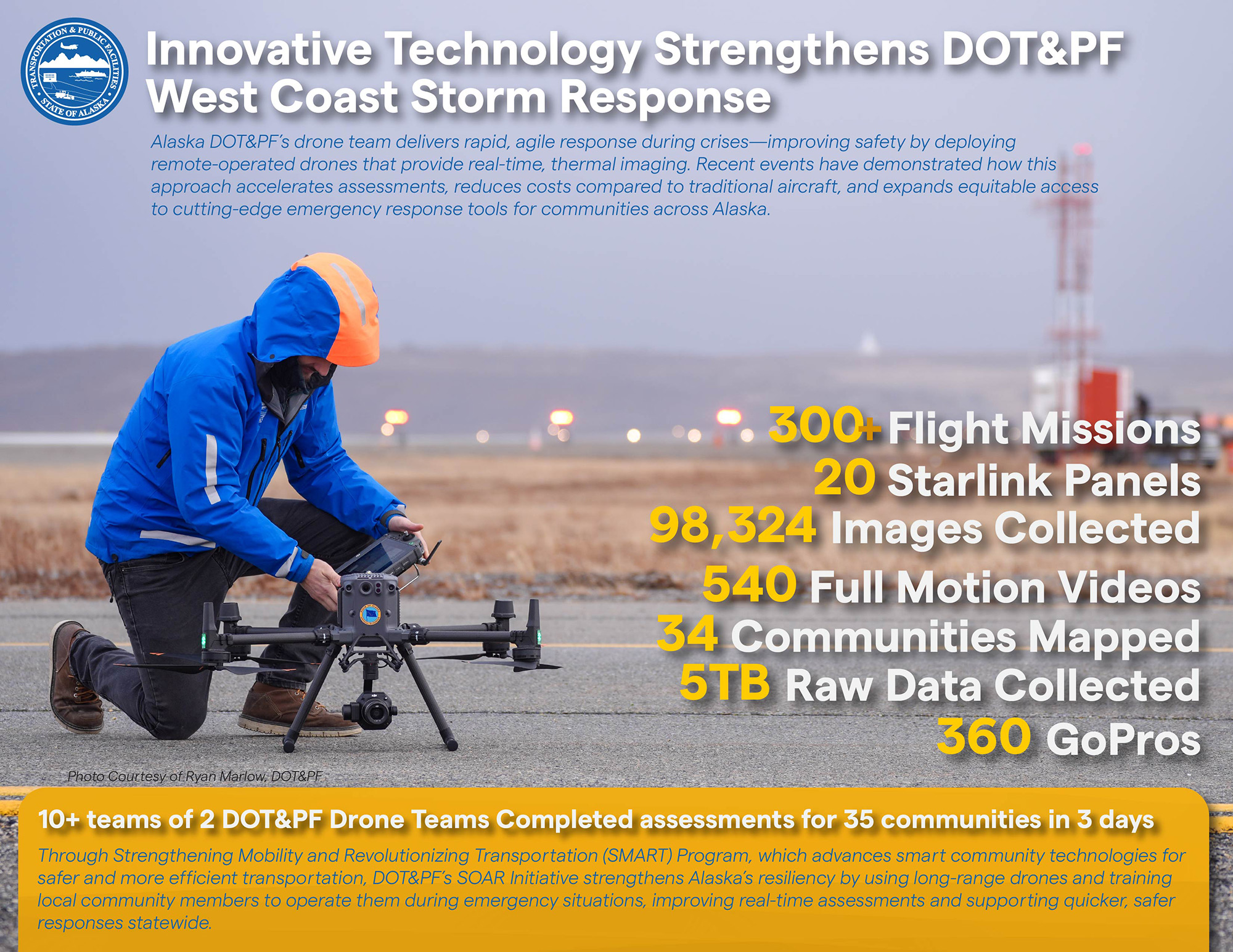 Alaska DOT&PF is transforming emergency response through rapid, technology-enabled assessments that deliver real-time insight when and where it matters most. This innovative approach accelerates damage assessments, improves responder safety, reduces reliance on costly aircraft, and expands access to advanced tools for communities across Alaska.